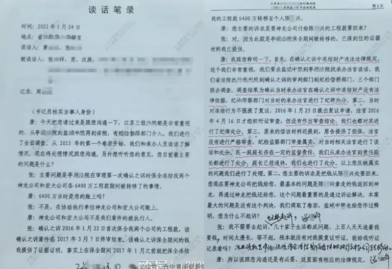 张继祥的维权之路,在2022年1月24日迎来一次关键转折。江苏省高级法院在(2021)苏执监538号案件谈话中,明确指出亭湖法院在该案中存在"三项程序瑕疵":在无给付内容的确认之诉中采取保全措施不当而无法律依据;对当事人复议申请未予审查;对保全担保人资格审查不严。省高院同时告知张继祥,已对涉及的五名法官作出处理,并承诺会协调推动问题解决。