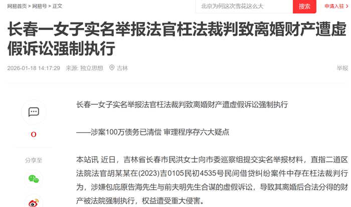 本站讯 近日,吉林省长春市民洪女士向市委巡察组提交实名举报材料,直指二道区法院法官胡某某在(2023)吉0105民初4535号民间借贷纠纷案件中存在枉法裁判行为,涉嫌包庇原告海先生与前夫明先生合谋的虚假诉讼,导致其离婚后合法分得的财产被法院强制执行,权益遭受重大侵害。